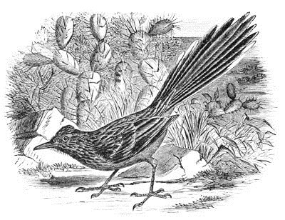 This remarkable genus is represented in the United States by a single species, known as the Paisano, Chaparral Cock, or sometimes Road-Runner, on account of its frequenting public highways. Its very long legs enable it to run with great rapidity, faster even than a fleet horse. A second species occurs in Mexico, the Geococcyx affinis of Hartlaub. This is smaller, and differently proportioned. In both the feathers above are bronzed brown and green; nearly all with opaque white edges; beneath white, with black streaks on the sides of neck and breast; the feathers with broad white tips; the principal differences are as follows:—