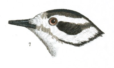 a. Two white stripes on the side of the head, one above, and the other below, the ear-coverts, which are mostly black. First quill shorter than sixth. Tail-feathers broad and obtuse at ends, the narrowed tips of middle feathers very short.