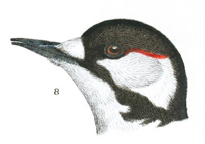 4. P. nuttalli. Anterior portion of back not banded with white; lores and nasal tufts white. Black stripes on side of the head very much broader than the white ones, and connected by a narrow strip with the black of the shoulders. Male with only the nape and occiput red. Hab. California (only).