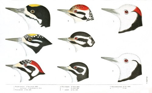 This strongly marked genus appears to be composed of two sections and three well-defined species; the first being characterized by having the back variegated with whitish, and the jugulum with a sharply defined crescentic patch of black, though the latter is sometimes concealed by red, when the whole head and neck are of the latter color, and the sharply defined striped pattern of the cephalic regions, seen in the normal plumage, obliterated. Comparing the extreme conditions of plumage to be seen in this type, as in the females of varius and of ruber, the differences appear wide indeed, and few would entertain for a moment a suspicion of their specific identity; yet upon carefully examining a sufficiently large series of specimens, we find these extremes to be connected by an unbroken transition, and are thus led to view these different conditions as manifestations of a peculiar law principally affecting a certain color, which leads us irresistibly to the conclusion that the group which at first seemed to compose a section of the genus is in reality only an association of forms of specific identity. Beginning with the birds of the Atlantic region (S. varius), we find in this series the minimum amount of red; indeed, many adult females occur which lack this color entirely, having not only the whole throat white, but the entire pileum glossy-black; usually, however, the latter is crimson. In adult males from this region the front and crown are always crimson, sharply defined, and bordered laterally and posteriorly with glossy-black; and below the black occipital band is another of dirty white; the crimson of the throat is wholly confined between the continuous broad, black malar stripes, and there is no tinge of red on the auriculars; there is a broad, sharply defined stripe of white beginning with the nasal tufts, passing beneath the black loral and auricular stripe, and continuing downward into the yellowish of the abdomen, giving the large, glossy-black pectoral area a sharply defined outline; the dirty whitish nuchal band is continued forward beneath the black occipital crescent to above the middle of the eye. The pattern just described will be found in ninety-nine out of a hundred specimens from the Eastern Province of North America (also the West Indies and whole of Mexico); but a single adult male, from Carlisle, Penn. (No. 12,071, W. M. Baird), has the whitish nuchal band distinctly tinged with red, though differing in this respect only, while an adult female, from Washington, D. C. (No. 12,260, C. Drexler), has the lower part of the throat much mixed with red.