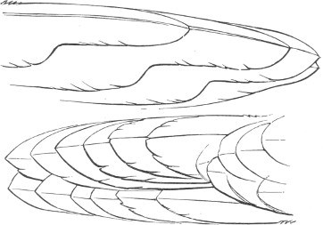 3. Pandion. Outer toe reversible; claws contracted and rounded on their under surface, and not graduated in size.41 Wing long, third quill longest; outer four with inner webs emarginated. Tail rather short, rounded.