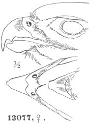 16. Haliætus. Tarsus feathered in front one third, or more, of the way down; the naked portion with an imperfectly continuous frontal, and less well defined posterior, series of transverse plates, and covered elsewhere with roundish granular scales. Feathers of the neck, all round, lanceolate, distinct. Bill very large, the chord of the culmen more than twice as long as the cere on top; nostril oval, obliquely vertical. Third to fifth quills longest; outer six with inner webs cut. Tail rounded or cuneate, sometimes consisting of fourteen feathers.