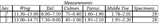 No. 45,814 (♀, Sitka, Alaska, May, 1866; F. Bischoff). Wing, 14.90; tail, 8.50; tarsus, 2.10; middle toe, 2.20. The two similar in color, but in the latter the white streaks on the lower parts a little broader, and the middle of the auriculars slightly streaked.