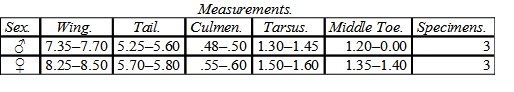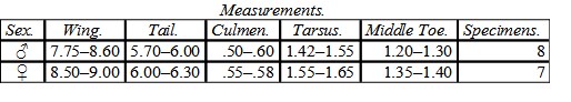 Male (No. 4,477, Shoalwater Bay, Washington Territory; J. G. Cooper). Wing, 7.35; tail, 5.25; culmen, .50; tarsus, 1.30; middle toe, 1.25.