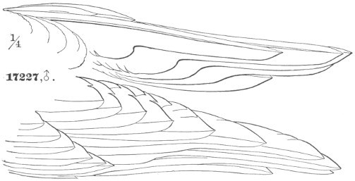 Gen. Char. Form swallow-like, the tail excessively lengthened and forked, and the wings extremely long. Bill rather small, and narrow; commissure faintly sinuated; upper outline of the lower mandible very convex, the depth of the mandible at the base being only about half that through the middle; gonys drooping terminally, nearly straight. Side of the head densely feathered close up to the eyelids. Nostril ovoid, obliquely vertical. Feet small, but robust; tarsus about equal to middle toe, covered with large, very irregular scales; toes with transverse scutellæ to their base; claws short, but strongly curved; grooved beneath, their edges sharp. Second or third quill longest; first shorter than, equal to, or longer than, the fourth; two outer primaries with inner webs sinuated. Tail with the outer pair of feathers more than twice as long as the middle pair.