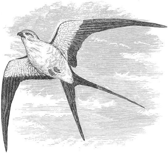 Nauclerus forficatus, (Linn.) RidgwaySWALLOW-TAILED HAWK; FORK-TAILED KITEAccipiter cauda furcata, Catesby, Carolina, I, pl. iv, 1754. Falco forficatus, Linn. Syst. Nat. I, 89, 1758. Falco furcatus, Linn. Syst. Nat. p. 129, 1766.—Penn. Arct. Zoöl. p. 210, No. 108, pl. x.—Gmel. Syst. Nat. p. 262. Nauclerus forficatus, Ridgway, P. A. N. S. Phil. Dec. 1870, 144.—Daud. Tr. Orn. II, 152.—Shaw, Nat. Misc. pl. cciv; Zoöl. VII, 107.—Wils. Am. Orn. pl. li, f. 3, 1808.—Aud. Birds Am. pl. 72, 1831; Orn. Biog. I, 368; V, 371.—Bonap. Ann. Lyc. N. Y. II, 31; Isis, 1832, 1138. Milvus furcatus, Vieill. Ois. Am. Sept. pl. x, 1807. Elanoides furcatus, Gray, List B. Brit. Mus. p. 44, 1844.—Strickl. Orn. Syn. I, 141, 1855.—Owen, Ibis, II, 1860, 240 (habits). Nauclerus furcatus, Vig. Zoöl. Journ. II, 387; Isis, 1830, p. 1043.—Less. Man. Orn. I, 101; Tr. Orn. p. 73.—Swains. Classif. B. I, 312; II, 210, 1837.—Bonap. List, p. 4; Cat. Ucc. Eur. p. 20; Consp. Av. p. 21.—Gould, B. Eur. pl. xxx.—Aud. Synop. p. 14, 1839.—Rich. Schomb. Reis. Brit. Guian. p. 735.—De Kay, Zoöl. N. Y. II, p. 12, pl. vii, f. 15.—Gray, Gen. B. fol. sp. 1, pl. ix, f. 9; Gen. & Subgen. Brit. Mus. p. 6.—Brew. (Wils.) Synop. Am. Orn. p. 685.—Woodh. Sitgr. Exp. Zuñi & Colorado, p. 60.—Kaup, Monog. Falconidæ, Cont. Orn. 1850, p. 57.—Brewer, Oölogy, I, 1857, 38.—Cass. Birds N. Am. 1858, 36.—Coues, Prod. Orn. Ariz. 1866, p. 12.—Dresser, Ibis, 1865, 525 (Texas, nesting).—Gray, Hand List, I, 27, 1869. Elanus furcatus, Vig. Zoöl. Journ. I, 340.—Steph. Zoöl. XIII, pl. ii, p. 49.—Cuv. Règ. An. (ed. 2), I, p. 334.—James. (Wils.) Am. Orn. I, 75.—Jard. (Wils.) Am. Orn. II, 275.—Jard. Orn. Eur. p. 29.—Nutt. Man. p. 94. Accipiter milvus carolinensis, Briss. Orn. I, 418, 1760. Elanoides yetapa, Vieill. Enc. Méth. III, 1205, 1823.