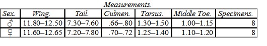 Female. Wing, 12.80; tail, 7.10; tarsus, 1.45; middle toe, 1.35.
