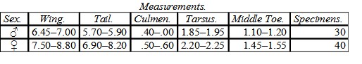 Specimens from different regions vary but little in size. The largest are 4,198, ♀, San Francisco, Cal., winter, 16,957, ♀, Hudson’s Bay Territory, and 55,016, ♀, Mazatlan, Mexico, in which the wing ranges from 8.40 to 8.50, the tail 7.00. The smallest females are 45,826, Sitka, Alaska, and 11,791, Simiahmoo, W. T., in which the wing measures about 7.80. A female (32,499) from Orizaba, Mexico, one (8,513) from Fort Yuma, Cal., and one (17,210) from San Nicholas, Lower California, have the wing 8.00, which is about the average. The largest males are 54,336, Nulato, Alaska, 58,137, Kodiak, Alaska, 27,067, Yukon, mouth of Porcupine, and 55,017, Mazatlan, Mexico, in which the wing measures 7.00, the tail 5.60. The smallest males are 5,990, Orange, N. J., 8,514, Shoalwater Bay, W. T., 21,338, Siskiyou Co., Cal., 37,428, Orizaba, Mexico, and 5,584, Bridger’s Pass, Utah; in this series the wing measures 6.50–6.70, the tail 5.40–5.60. A specimen from Costa Rica measures: wing 6.70, tail 5.35. Thus the variation in size will be seen to be an individual difference, rather than characteristic of any region. Some immature specimens from the northwest coast of North America (as 45,828, ♂, Sitka, Rus. Am., 5,845, ♂, Fort Steilacoom, W. T., 11,791, Simiahmoo, Puget Sound, and 8,514, Shoalwater Bay, W. T.) are much darker than others, the brown above inclining to blackish-sepia; no other differences, however, are observable. An adult from the Yukon (54,337, ♀) has the rufous bars beneath remarkably faint, although well defined; another (19,384, ♀, Fort Resolution), in immature plumage, has the longitudinal markings beneath so faint that they are scarcely discernible, and the plumage generally has a very worn and faded appearance. A male in fine plumage (10,759, Fort Bridger, Utah) has the delicate reddish-rufous beneath so extended as to prevail, and with scarcely any variegation on the sides and tibiæ; the bars on the tail, also, are quite obsolete.