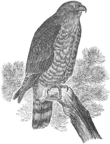 The Broad-winged Hawk was first described by Wilson, who shot a single specimen that had been feeding on a meadow-mouse. On his approach it uttered a whining whistle and flew to another tree. Another of the same species was observed, and its movements were in wide circles, with unmoving wings. Nuttall never met with it, and regarded it as very rare.