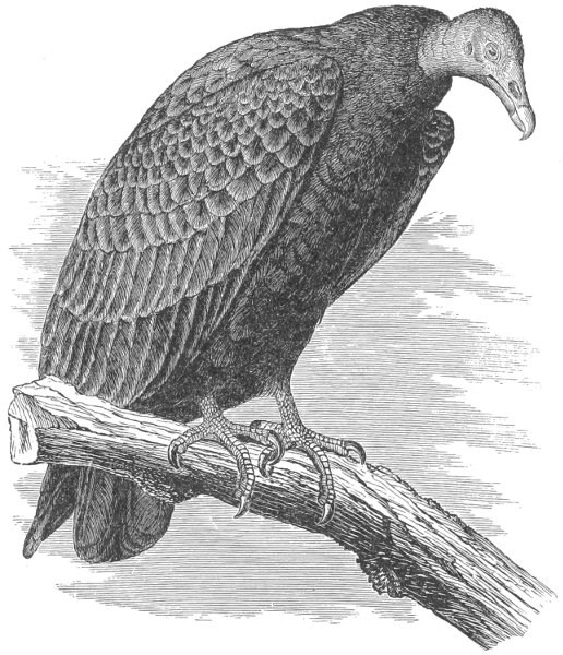 Catharista atrata (Bartram)CARRION CROW; BLACK VULTUREVultur atratus, Bartram, Trav. Carol. 285, 1792.—Meyer, Zool. Ann. I, 290.—Ord (Wils.) Am. Orn. pl. lxxv, f. 2.—Aud. Birds Am. pl. cvi.—Brewst. Ed. Journ. Sc. Ser. 1, VI, 156. Cathartes atratus, Less. Man. Orn. I, 73, 1828.—Rich. & Swains. F. B. A. II, 6, 1831.—Darw. Journ. Res. p. 68; Zool. Beag. pt. iii, p. 7.—Swains. Classif. B. II, 206.—James. (Wils.) Am. Orn. I, 10.—Brewer (Wils.) Am. Orn. Synop. Birds Am. p. 682.—Ib. N. A. Oölogy.—Aud. Synop. Birds Am. p. 3.—Bridg. Proc. Zoöl. Soc. pt. xi, p. 108; Am. Nat. Hist. XIII, 498.—Bonap. Consp. p. 9.—De Kay, Zoöl. N. Y. II, 3.—Reich. Prakt. Nat. Vög. p. 27.—Cass. Bird N. Am. 1858, 5.—Coues, Key, 1872, 222. Catharista atratus, Gray, Hand List, I, 1869, 3, No. 16. Vultur aura niger β, Kerr, Transl. Gmel. 473, 1792. Vultur aura (not of Linn.!), Daud. Tr. Orn. II, 19 (quotes Pl. Enl. 187, 1800). Vultur urubu, Vieill. Ois. Am. Sept. pl. ii, 1807.—Lath. Gen. Hist. I, 14. Cathartes urubu, Less. Tr. Orn. p. 27, 1831.—D’Orb. Voy. Am. Mérid. Ois. p. 31, pl. i. Percnopterus urubu, Steph. Zoöl. XIII, 7, pl. xxxi, 1826. Vultur iota, Jard. (Wils.) Am. Orn. III, 226, 1832.—Ord (Wils.) Am. Orn. (ed. 2). Neophron iota, Cuv. Règ. An. (ed. 2), I, 317, 1829. Cathartes iota, Bonap. Ann. Lyc. N. B. p. 23; Isis, 1832, p. 1135; List, p. 1.—King, Voy. Beag. I, 532.—Nutt. Man. I, 46.—Peale, U. S. Expl. Exp. VIII, 59. Cathartes fœtens, Illig. Mus. Berol.—Licht. Verz. Doubl. p. 63, 1823.—Gray, Gen. B. sp. 1, pl. i, f. 3.—Max. Beitr. III, 58.—Rich. Schomb. Faun. Brit. Guian. p. 742.—Cab. Av. Consp. Wieg. Archiv, 1844, 262; Faun. Per. Orn. p. 71.—Hartl. Syst. Ind. Azar. p. 1.