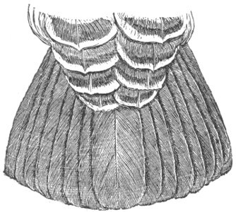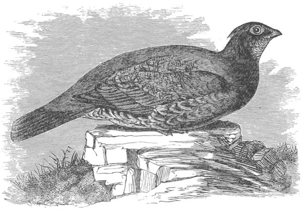 The same author corrects the statements of Douglas as to certain habits of this species. The males are said not to be particularly pugnacious, and very rarely forsake the boughs of the pine or fir trees for a rocky eminence. They feed on berries only during a brief season in autumn, at all other times of the year subsisting upon the leaves of the pine and fir, especially those of the Douglas Fir. This food imparts a strong resinous flavor to the flesh of this Grouse, which, however, is not unpleasant, and after a while becomes quite attractive to the epicure. The love-notes of this bird are said to be deep, soft, plaintive, but unmusical, and resemble the whirring sounds made by a rattan, swung rapidly and in jerks through the air. These notes usually begin the first week in March. The young are able to fly feebly by the first of July. By the last of August they have attained their full size. In the winter they retire to the tops of the loftiest firs, where they pass the season in an almost immovable state of hibernation. Between July and winter they may be readily shot. Once raised, they invariably fly to trees. They heed but little the report of a gun unless they have been wounded. Their flesh is said to be midway between the color of the Pinnated and the Ruffed Grouse, partaking of their good qualities, but surpassing either.