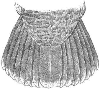 The first indication of their presence in spring is the courting call of the male. This is a prolonged sound, resembling the whir of a rattan cane moved rapidly through the air. This is repeated several times with considerable rapidity, and then stops for a brief interval. This is said to be produced by the alternate inflation and contraction of sacs, one on each side of the throat, which are usually concealed by the feathers, and are covered by an orange-colored, thick, corrugated skin. At Fort Steilacoom these birds were very abundant during the spring and early summer, and were mostly confined to the forests of firs. Later in the season, and after hatching, they are more generally found on the ground in search of berries and seeds. When alarmed, they seek safety among the dense foliage of the trees, seeming instinctively to understand the advantage of thus hiding. He has known an entire flock of five, concealed among the ferns and grass, to be shot one by one, without an attempt being made by a single individual to fly. This Grouse is said to be a very fine table bird, its pine taste only adding to its game-flavor. Their full weight is from 2¾ to 3½ pounds.