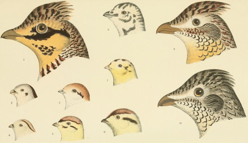 Habits. The Pinnated Grouse, more generally known through the country as the Prairie Chicken or Prairie Hen, once occurred as far to the east as Massachusetts, a few still remaining on the island of Martha’s Vineyard, and where it was, in the early settlement of the country, a very abundant bird; and to the southwest to Texas and throughout the Indian Territory, where it appears to be extending with the areas developed by civilization. While at the East this bird has almost entirely disappeared, in consequence of the increase of population, and except here and there in a few small and distant districts has disappeared from the Middle and Eastern States, at the West and Southwest it has greatly extended its distribution, appearing in considerable numbers, and constantly increasing as the country is settled and the land cultivated with grain. Even in Illinois, where there has been a large increase of population during the past ten years, these birds are known to have become much more numerous. It is, however, probable that they will again be driven from this region when the population becomes quite dense. Mr. Allen met with this species in several points in Kansas and in Colorado, where they had either just made their appearance, or where they had recently been noticed, and were observed to be on the increase. The small remnants left in Massachusetts are protected by law, which may preserve them a few years longer; and in Illinois and other Western States stringent provisions seek to prevent their wanton destruction. In Michigan, according to Mr. D. D. Hughes, this Grouse is common in the two southern tiers of counties, but is rarely met with in that State farther north,—an absence attributable to the want of open country and suitable food, as west of Lake Michigan it is found in great abundance much farther north. In the more southern portion of the State it is already very rare, and in localities completely exterminated.
