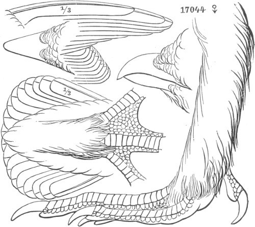 Gen. Char. Tail of eighteen feathers, short, half the lengthened wings; the feathers stiffened and more or less graduated. Bare inflatable air-sac of the neck concealed by a tuft of long, stiff lanceolate feathers; an inconspicuous crest on the vertex. Tarsi feathered only to near the base, the lower joint scutellate. Culmen between the nasal fossæ scarcely one third the total length.
