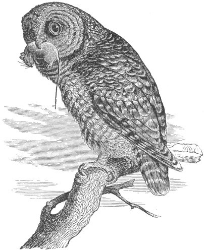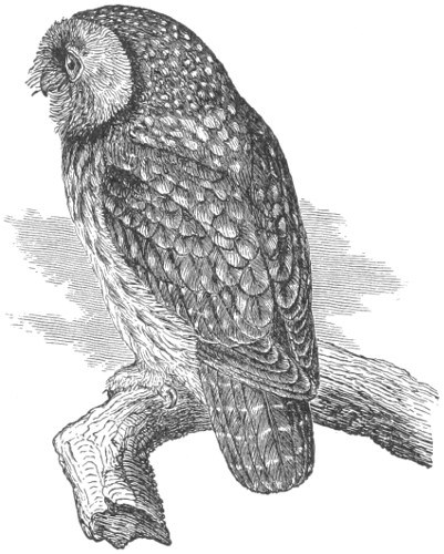 Mr. Dall obtained a female specimen of this Owl at Nulato, April 28, where it was not uncommon. It was often heard crying in the evenings, almost like a human being, and was quite fearless. It could be readily taken in the hand without its making any attempt to fly away, but it had a habit of biting viciously. It was frequently seen in the daytime sitting on trees. According to the Indians, it generally nests in holes in dead trees, and lays six spherical white eggs. Richardson informs us that it inhabits all the wooded country from Great Slave Lake to the United States, and is very common on the banks of the Saskatchewan. It was obtained in Canada by the Countess of Dalhousie, but at what season the bird was met with is not stated; the Smithsonian Institution also possesses specimens from the vicinity of Montreal. It probably does not breed so far south as that place, or, if so, very rarely. Mr. Audubon procured a specimen near Bangor, Maine, in September, the only one he ever met with.