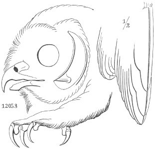 Gen. Char. Size small. Head very large, without ear-tufts. Eyes moderate; iris yellow. Two outer primaries only with their inner webs distinctly emarginated. Tarsi and toes densely, but closely, feathered. Ear-conch very large, nearly as high as the skull, with an anterior operculum; the two ears exceedingly asymmetrical, not only externally, but in their osteological structure. Furcula not anchylosed posteriorly, but joined by a membrane.