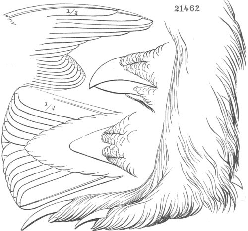 Winter. Entire plumage, except the tail (which is black with a white tip), immaculate snowy-white; shafts of primaries black. Male (34,968, Northwest R., Labrador; D. Smith). Wing, 7.50; bill, .42 by .45. Female (50,060, Nulato, Lower Yukon, April 12, 1867; W. H. Dall). Wing, 7.50; bill, .42 by .42.