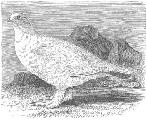 Habits. Richardson regarded this species as an inhabitant of the fur countries from the 50th to the 70th parallel of latitude, being partially migratory within those limits. It was found to breed among the valleys of the Rocky Mountains, on the barren grounds, and along the Arctic coasts. On the approach of winter it collects in flocks, and retires southward as the severity of the weather increases. They remain, however, in considerable numbers as far north as latitude 67° even in the coldest winters. It was found to be tolerably abundant at the 65th parallel all the year, assembling in vast flocks on the shores of Hudson Bay in the winter time. Mr. Hutchins states that ten thousand of these birds have been captured in a single season at Severn River. Richardson adds that in 1819 these birds made their first appearance at Cumberland House, latitude 54°, in the second week of November, and that they returned to the northward again before the beginning of spring. In the winter they are said to shelter themselves in thickets of willows and dwarf birches, on the banks of marshes and lakes, the buds of the smaller shrubs being the principal part of their food at that season. Denuded sandy spots were their favorite resorts in the daytime, but they passed their nights in holes in the snow. When pursued by sportsmen or birds of prey, they often terminate their flight by hastily diving into the loose snow, working their way beneath its surface with considerable celerity. In thick, windy, or snowy weather they were very shy, perching on the taller willows, where it required a sharp eye to distinguish them from flakes of snow. In the summer season they feed chiefly on the berries of the alpine arbutus and other shrubs and plants, which are laid bare by the thaw, and which do not disappear until they are replaced by a new crop. They incubate about the beginning of June, at which time the females moult. The males assume their red-colored plumage as soon as the rocks and eminences become bare, at which time they are in the habit of standing upon large stones, calling in a loud and croaking voice to their mates, which, still in their white wintry garb, are hidden in the snows below. These birds are more usually in motion in the milder light of night than in the broad glare of day.