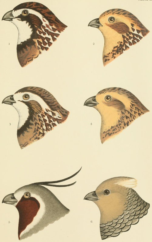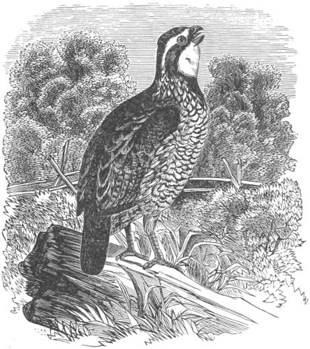 Tetrao virginianus, Linn. Syst. Nat. I, 1766, 277, 16 (female?).—Gmelin, I, 1788, 761. Perdix virginiana, Lath. Ind. Orn. II, 1790, 650.—Wilson, Am. Orn. VI, 1812, 21, pl. xlvii.—Doughty’s Cab. I, 1830, 37, pl. iv.—Aud. Orn. Biog. I, 1831, 388; V, 1839, 564, pl. lxxvi. Perdix (Ortyx) virginiana, Bonap. Obs. Wils. 1825, No. 203. Ortyx virginiana, Jardine, Nat. Library Birds, IV, Game Birds, 101, pl. x.—Bon. List, 1838.—Aud. Syn. 1839, 199.—Ib. Birds Amer. V, 1842, 59, pl. cclxxxix.—Gould, Mon. Odont. pl. i.—Baird, Birds N. Am. 1858, 640.—Newton, Ibis, I, 255 (Santa Cruz; introduced!).—Bryant, B. Pr. VII, 1859 (Bahamas; introduced!).—Sclater, P. Z. S. 1861, 80 (Jamaica).—March, P. A. N. S. 1863, 303 (Jamaica).—Max. Cab. J. VII, 1858, 444.—Gray, Cat. Brit. Mus. V, 1867, 75.—Fowler, Am. Nat. III, Dec. 1869, 535 (habits). Perdix (Colinia) virginiana, Nuttall, Man. I, 1832, 646. Tetrao marilandicus, Linn. Syst. Nat. I, 1766, 277, 18.—Gmelin, I, 1788, 761, 17. Perdix marilandica, Latham, Ind. Orn. II, 1790, 650. Tetrao minor, Bartram, Travels, 1791, 290 bis. Perdix borealis, Vieillot, Nouv. Dict.—Ib. Galerie, II, 44, pl. ccxiv. Ortyx borealis, Steph., Shaw’s Zoöl. XI, 1819, 377. Virginia Partridge, Latham, Syn. II, ii, 777. Ortyx castaneus, Gould, P. Z. S. X, 182.—Ib. Mon. Odont. (A somewhat melanistic plumage, occasionally seen in specimens from Iowa, Illinois, etc. ?)