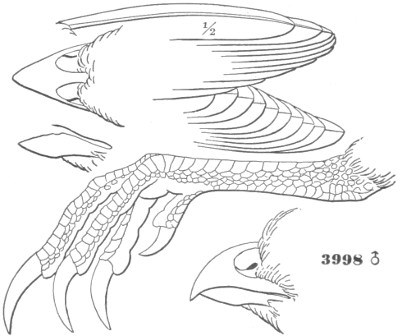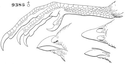 Gen. Char. Bill very stout and robust. Head with a broad, soft occipital crest of short decumbent feathers. Tail very short, half the length of the wings, composed of soft feathers, the longest scarcely longer than the coverts; much graduated. Wings long and broad, the coverts and tertials so much enlarged as to conceal the quills. Feet robust, extending considerably beyond the tip of the tail. Claws very large, the outer lateral reaching nearly to the middle of the central anterior. The toes without the claws, however, are very short. Sexes very different.