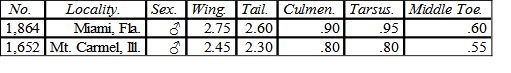 In coloration they are more nearly alike, the Florida specimen being hardly appreciably darker on the upper surface, though the lower parts are much deeper ochraceous, almost rufous. The Illinois specimen is deep ochraceous beneath, just about intermediate between Maryland and Florida specimens. Another Florida specimen (No. 62,733, Mus. S. I.; C. J. Maynard) measures: wing, 2.50; tail, 2.40; culmen, .85.