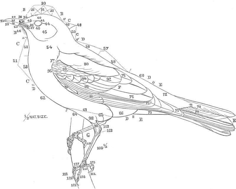 The following terms, English and Latin, are those most generally employed in describing the external form of birds, and are principally as defined by Illiger. In cases where there is no suitable English word in use, the Latin equivalent only is given. The figure selected for illustration, drawn by Mr. R. Ridgway, is that of the common American robin (Turdus migratorius, L.), and will be familiar to most students of ornithology.