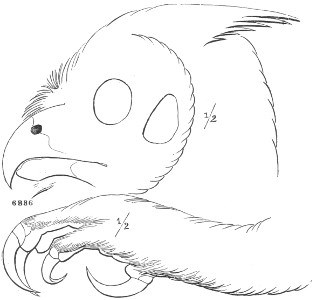 Gen. Char. Size varying from medium to very large; head with or without ear-tufts. Bill black; iris yellow. Two to four outer quills with their inner webs emarginated. Third or fourth quill longest. Bill very robust, the lower mandible nearly truncated and with a deep notch near the end; cere gradually ascending basally (not arched) or nearly straight, not equal to the culmen. Tail short, a little more than half the wing, slightly rounded. Ear-conch small, simple, without operculum; the two ears symmetrical.