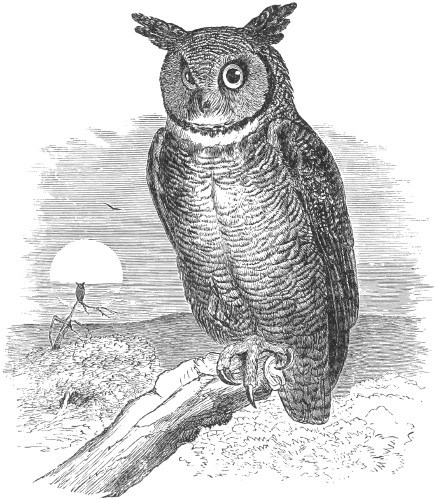 Its flight is rapid and graceful, and more like that of an eagle than one of this family. It sails easily and in large circles. It is nocturnal in its habits, and is very rarely seen abroad in the day, and then only in cloudy weather or late in the afternoon. When detected in its hiding-place by the Jay, Crow, or King-bird, and driven forth by their annoyances, it labors under great disadvantages, and flies at random in a hesitating flight, until twilight enables it to retaliate upon its tormentors. The hooting and nocturnal cries of the Great Horned Owl are a remarkable feature in its habits. These are chiefly during its breeding-season, especially the peculiar loud and vociferous cries known as its hooting. At times it will utter a single shriek, sounding like the yell of some unearthly being, while again it barks incessantly like a dog, and the resemblance is so natural as to provoke a rejoinder from its canine prototype. Occasionally it utters sounds resembling the half-choking cries of a person nearly strangled, and, attracted by the watchfire of a camp, fly over it, shrieking a cry resembling waugh-hōō. It is not surprising that with all these combinations and variations of unearthly cries these birds should have been held in awe by the aborigines, their cries being sufficiently fearful to startle even the least timid.