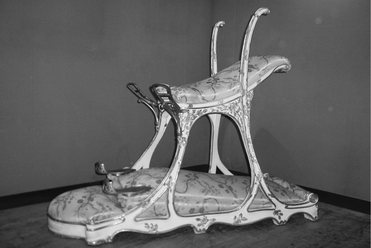 Known as the ‘siège d’amour’, this contraption was manufactured to suffer the enormous regal bulk while His Majesty guzzled vintage and shagged two at once. The future Edward VII was never a ‘Victorian’, he simply waited for history to catch him up. Like a sort of cement-mixer in a top hat, he risked apoplexy on a daily basis, and the whole fucking lot of them could have been up the Mall in black crêpe next Saturday.