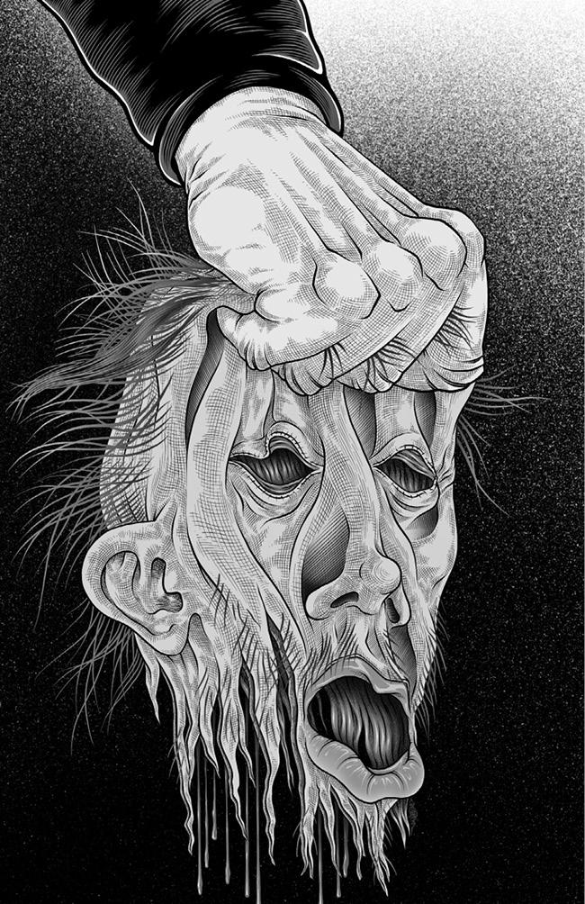 Одновременно с этим сокрушительным ударом женщина, не поворачивая голову, выбросила руку назад и вцепилась в волосы второго, который был уже у самого моего носа. Словно в замедленной съeмке, я увидел, как ладонь плотно ложится на его голову и медленно сжимается в кулак прямо на макушке, стягивая и волосы, и кожу несчастного в кровоточащий комок. Намертво стиснув этот клубок, она резко дeрнула косматую шевелюру в сторону, противоположную движению его тела. Кожа с треском лопнула в районе шеи и соскользнула с головы вместе с лицом, будто мокрая балаклава. Превратившись в тряпку, сорванное лицо плеснуло на стену красными каплями. Молоток звякнул об пол почти одновременно с багром. Человек взвизгнул, вцепился трясущимися пальцами в скудные рыхлые комочки – единственное, что осталось на его черепе – и скрючился на плитах в позе эмбриона.