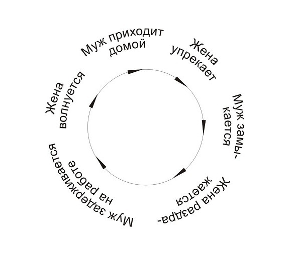 В системе человеческих взаимоотношений невозможно найти первопричину (рис.2). Например, муж задерживается на работе, жена волнуется его отсутствием. Когда муж наконец приходит домой, жена начинает его упрекать: «Где ты задержался? Почему не предупредил? Я места себе не нахожу» и т. д.