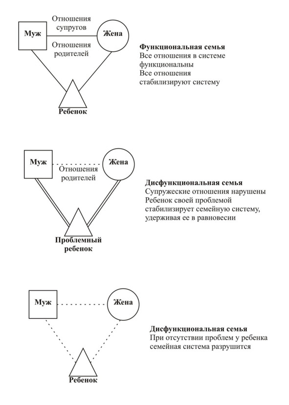 – трансформироваться, изменить структуру с переходом на другой уровень функционирования. Обычно трансформация следует за каким-либо сильным изменением одного элемента или сильным изменением отношений между двумя элементами. При этом главной трансформирующей силой в семье является супружеская пара – именно изменения в этой подсистеме приводят к изменениям в семейной системе в целом. Ухудшаются отношения между супругами – охлаждение отношение, увеличение негативных стереотипов взаимодействия между ними, появляются проблемы у ребенка (частые болезни, ухудшение учебы и т.д.). И наоборот, налаживаются отношения в супружеской паре, например, в ходе семейной психотерапии, и улучшаются отношения родителей с ребенком.