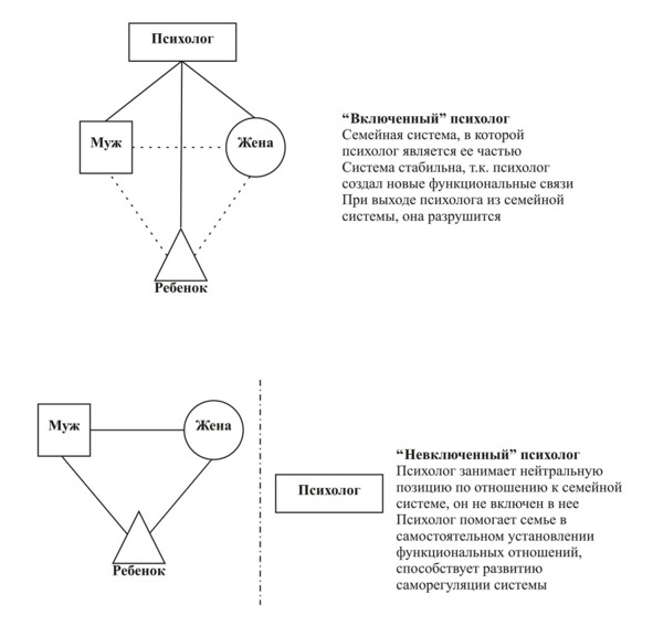 Однако, нередко психолог, стремясь «отрегулировать» семейную систему, сам становится ее частью через установление устойчивых отношений с членами семьи и даже приобретает определение место в структуре семьи, ее иерархии.