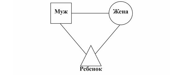 Если мы посмотрим на схему семьи (рис.5), то увидим, что «линии взаимоотношений» соединяют между собой только двух людей. Это означает, что нет отношения «родители – ребенок», а есть отношения «мама – ребенок» и «папа – ребенок».
