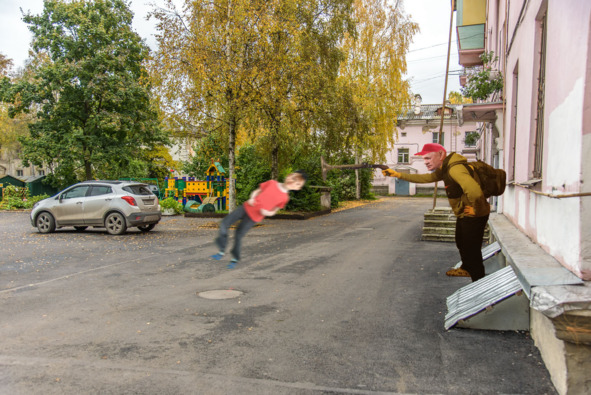 Засмеявшись, Большеухий полез в рюкзак и достал свой пистолет. После этого он пошёл за Вовой в соседний дворик. Во дворе близко никого из взрослых людей не было, поэтому Большеухий смело подошёл к Вове с пистолетом.