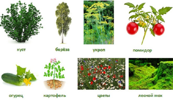 На земле растут – куст, берёза, укроп, огурцы, помидоры, картошка, цветы, лесной мох… что их всех объединяет? Каким одним словом ты бы назвал их всех? Что это?…