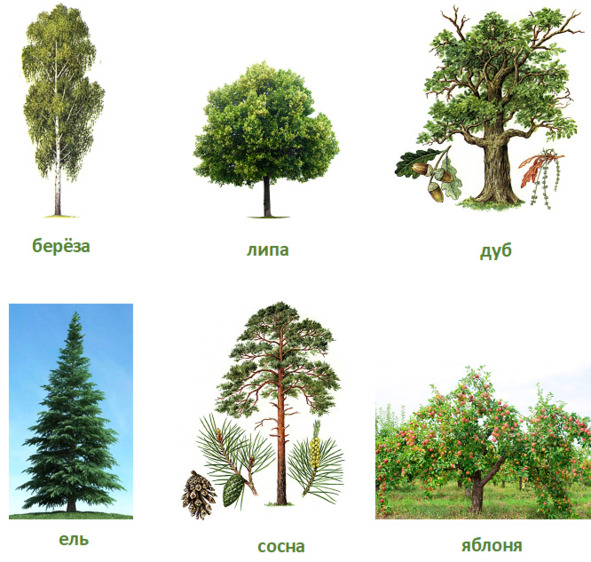 На земле растут – берёза, липа, дуб, ель, сосна, яблоня… что их всех объединяет? Каким одним словом ты бы назвал их всех? Что это?…