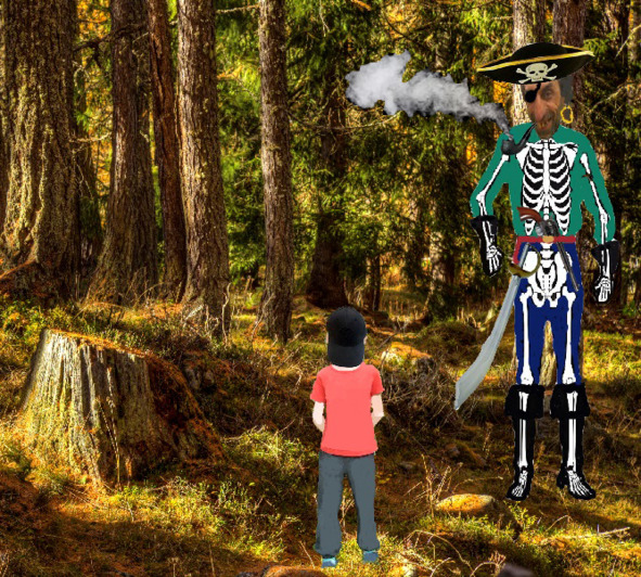 Вова вспомнил мультфильм «Остров сокровищ» … этот человек очень напоминал пирата. Вове стало так страшно, что он даже хотел повернуть обратно, к лесу-злыдню, но тут «пират» увидел Вову, вскочил с пенька, очень удивился и почему-то обрадовался? … при этом закричав: