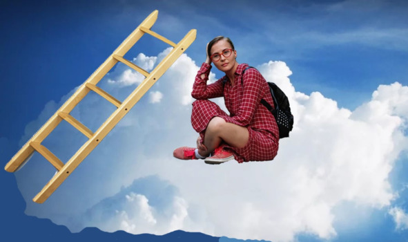 Вдруг на Вову упала прохладная тень, и ему стало немного легче. Он открыл глаза… На него сверху, прикрывая собой солнце, спускалось белое облачко. Облачко остановилось над самой головой Вовы, приятно охлаждая влагой окружающий воздух. С облачка опустилась деревянная лестница и по ней вниз к Вове сошла взрослая большая девочка в очках и с рюкзаком за спиной.