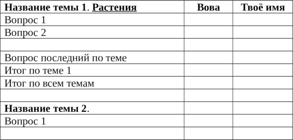 Да, ещё… чуть не забыл… Пусть твои родители или бабушка с дедушкой заведут для тебя специальную тетрадку, в которой вы будете записывать темы, по которым злыдни будут спрашивать Вову, а также номера вопросов и твои результаты ответов на них. Если твой ответ будет правильным, то ты сам будешь ставить для Вовы и для себя знак тире «-» … это хорошо. А, если ты сделаешь ошибку или не сумеешь ответить, то и Вове, и тебе ты поставишь крестик «+» … это плохо. После каждой темы ты подсчитаешь число тире и число крестиков. А, затем – вычти из числа тире число крестиков… Это будет итог по теме. Сложи итоги по всем пройденным темам… Это будет общий итог – твой вклад в освобождение Вовы, а также это будет твоя защита от Большеухого.