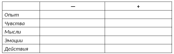 Заполнили минусовый столбец? Тогда переходим к столбцу под знаком «плюс» и заполним эту часть таблицы с точки зрения вашего желаемого образа жизни. Запишите сюда следующее: