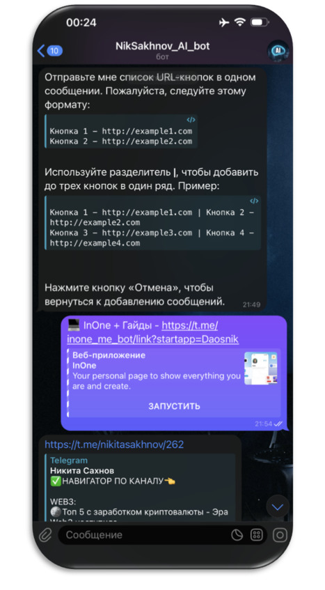 На этом скриншоте мы видим пример того, какой можно создать пост для канала с кнопкой, после чего закрепить его, и в вашем канале будет кнопка на указанный вами ресурс. Здесь, например, ссылка на мой «Хаб» – это приложение, в которое может зайти участник канала и посмотреть видео, гайды и многое другое, что размещено в моём хабе. Позже, если вы хотите использовать InOne и собрать свой Хаб для канала, этот этап будет описан далее в книге.
