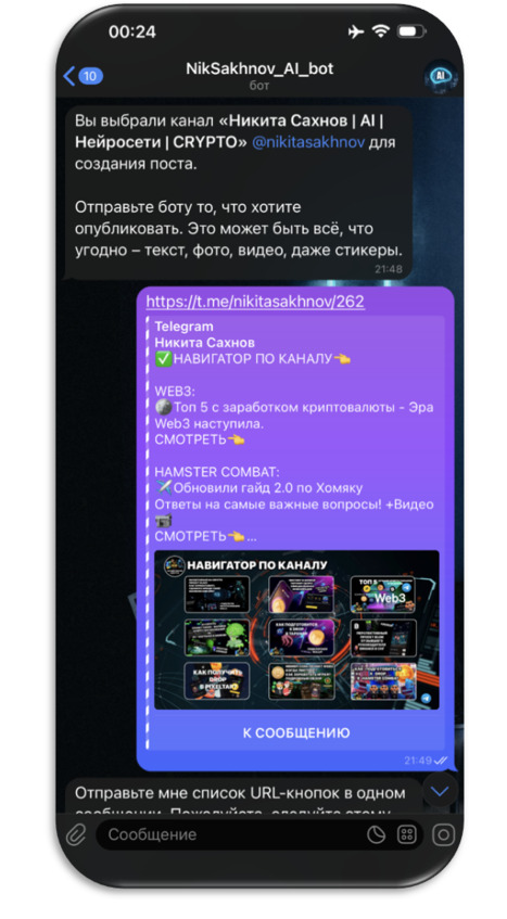 – Создайте пост: напишите текст, добавьте кнопки (например, URL-кнопки или inline-кнопки или приложение InOne или любое другое приложение), укажите время публикации (если нужен отложенный пост).