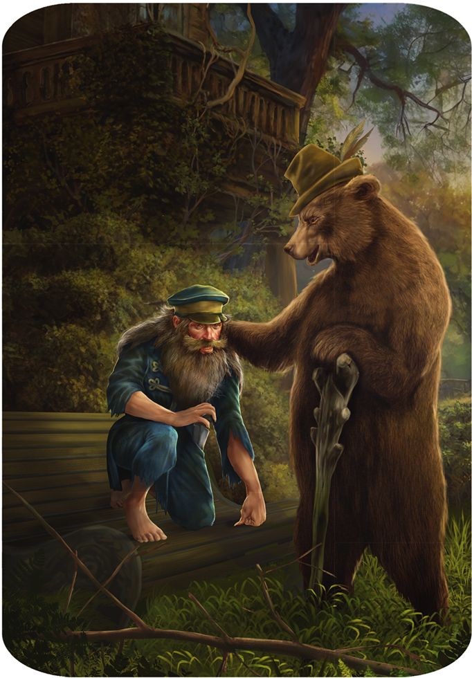 Много ли, мало ли времени прошло, только видит помещик, что в саду у него дорожки репейником поросли, в кустах змеи да гады всякие кишмя кишат, а в парке звери дикие воют. Однажды к самой усадьбе подошёл медведь, сел на корточках, поглядывает в окошки на помещика и облизывается.