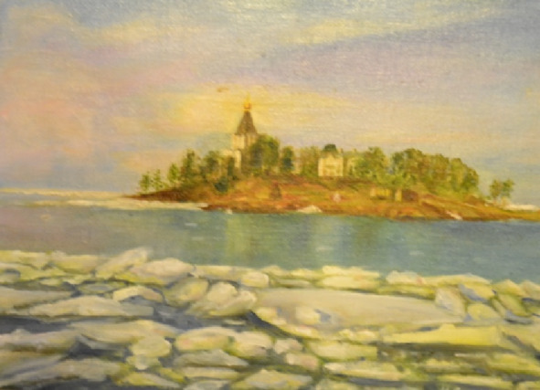 На севере в море есть остров один,Вокруг лишь вода и ещё много льдин.Здесь небо сияет, хоть солнышка нет, —Святой монастырь излучает свой свет!
