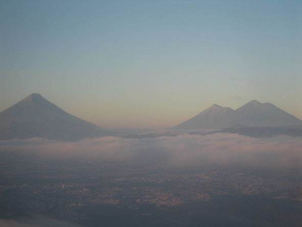 Но есть и минус: высокая сейсмичность. Один из наиболее активных вулканов планеты – Пакайя – давший о себе знать в мае и июне 2010 года, расположен всего в полусотне верст от города Гватемалы. Всего же в стране 37 вулканов. Самый высокий – Тахумулько. Выше него – 4220 м – нет вершин во всей Центральной Америке. Сквозь иллюминатор я вижу три вулкана: Акатенанго (3960 м), Фуэго (3763 м) и Агуа (3760 м). Они возвышаются над облаками. Здесь, наверху – только они. Город, оставшийся внизу, кажется настольной игрой, в которую эти три богатыря разрешили человеку пока поиграть.