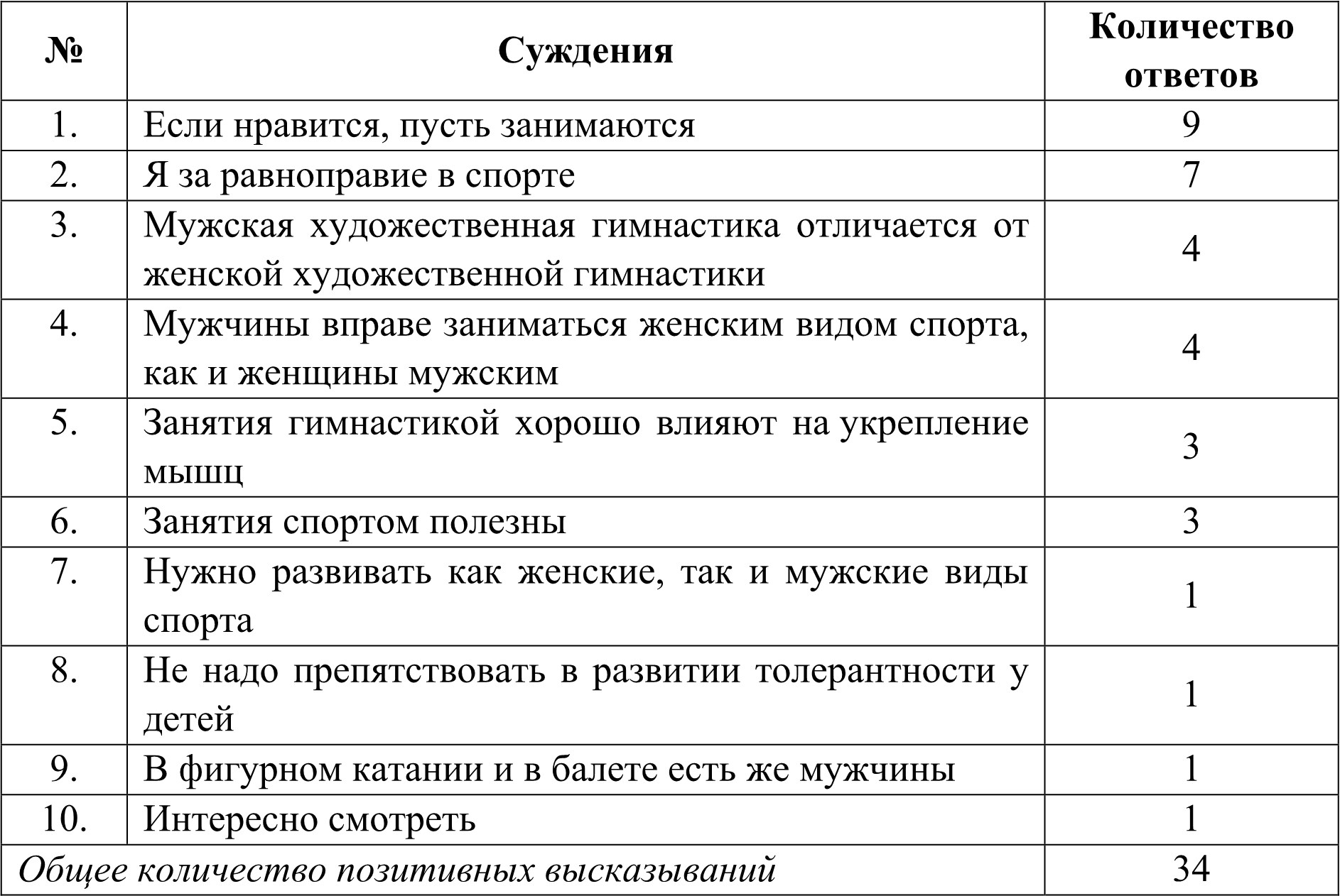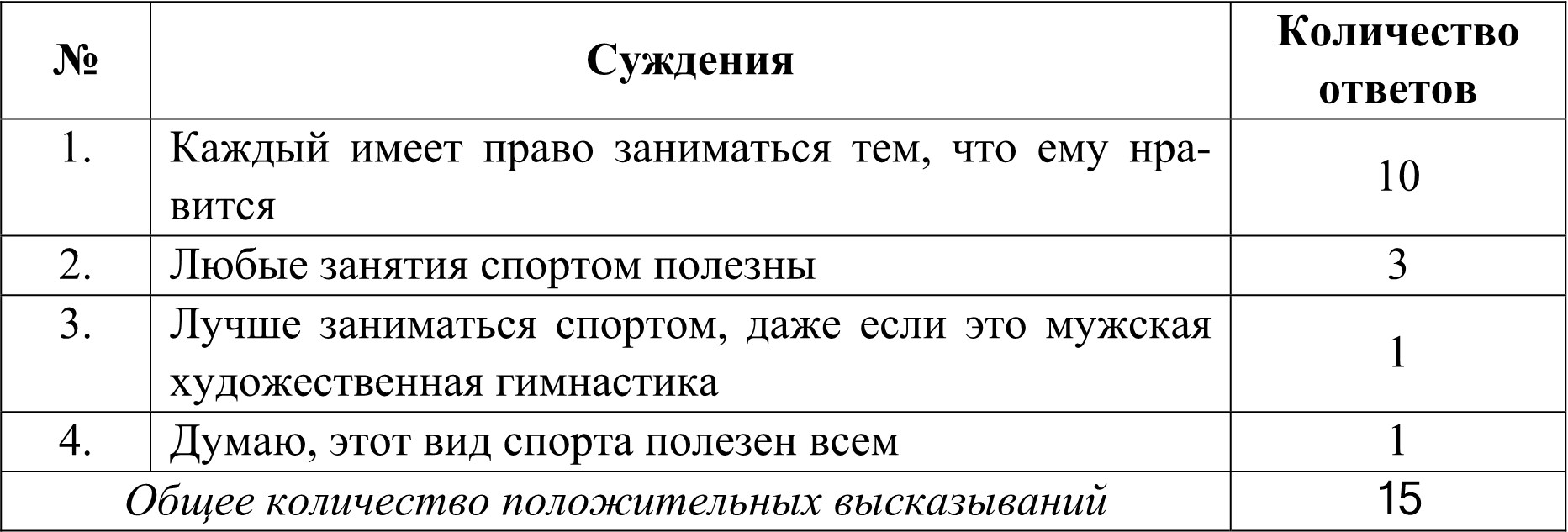 Что касается положительных высказываний юношей, то 2/3 из них – это голоса в пользу того, что «каждый имеет право заниматься тем, что ему нравится», остальная 1/3 высказываний – это аргументы в пользу полезности занятий спортом вообще и мужской художественной гимнастикой, в частности.