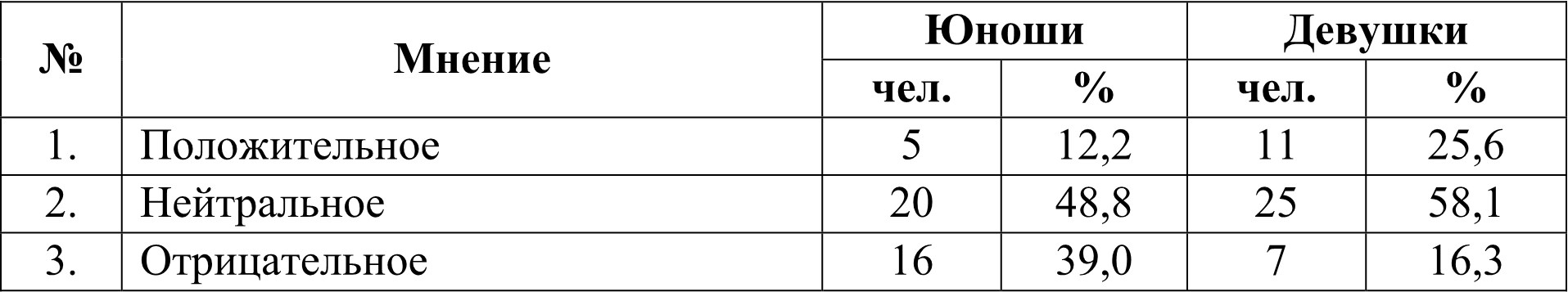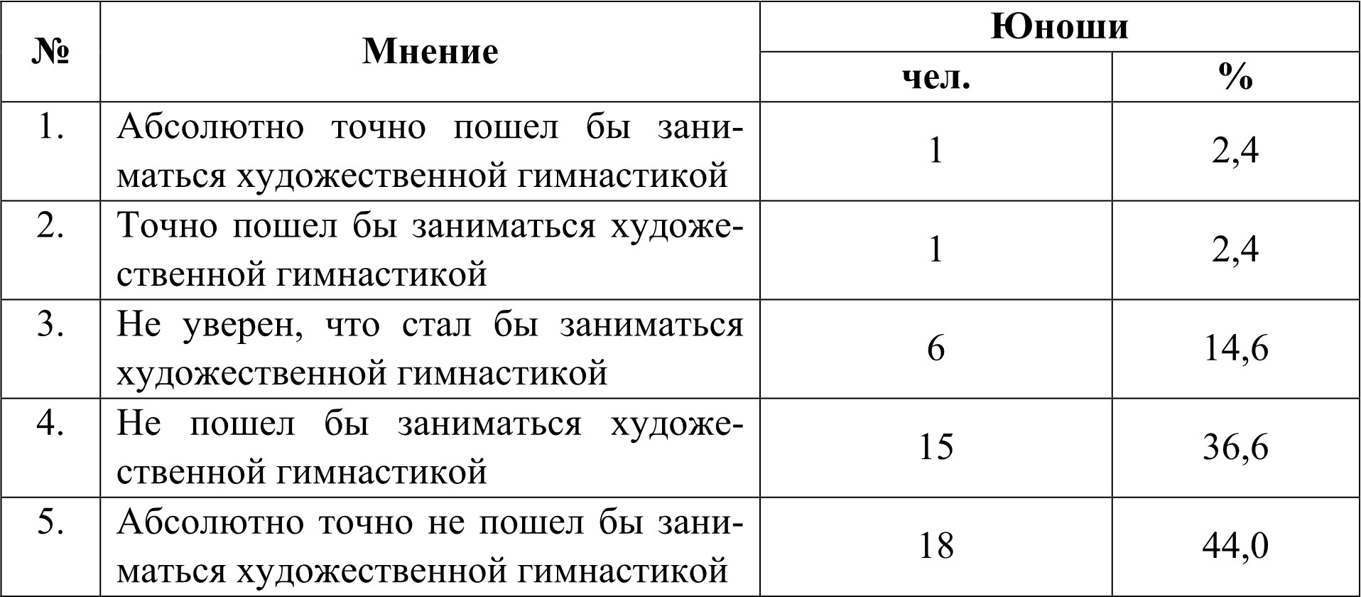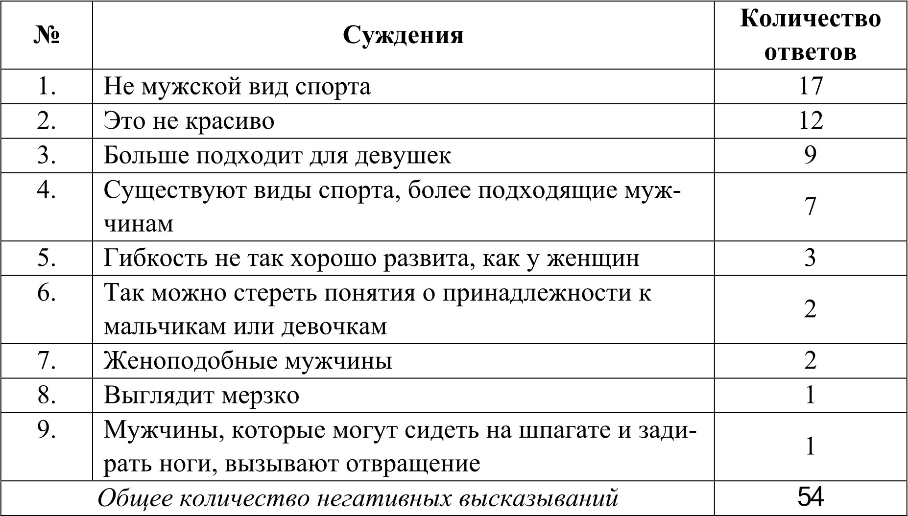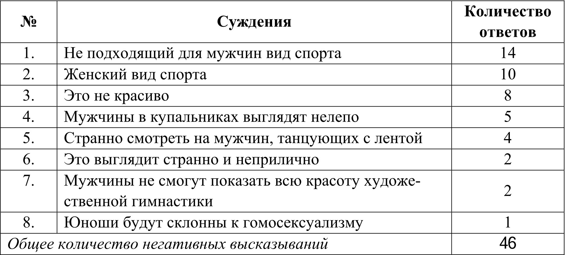 Из результатов математической обработки данных таблиц 1–4 усматривается, что общее количество отрицательных высказываний (с учетом частоты их появления в ответах респондентов) о мужской художественной гимнастике превышает количество положительных в 3,6 раз у юношей и в 1,3 раза у девушек, что указывает на выраженное негативное отношение современных студентов к данному виду спорта.