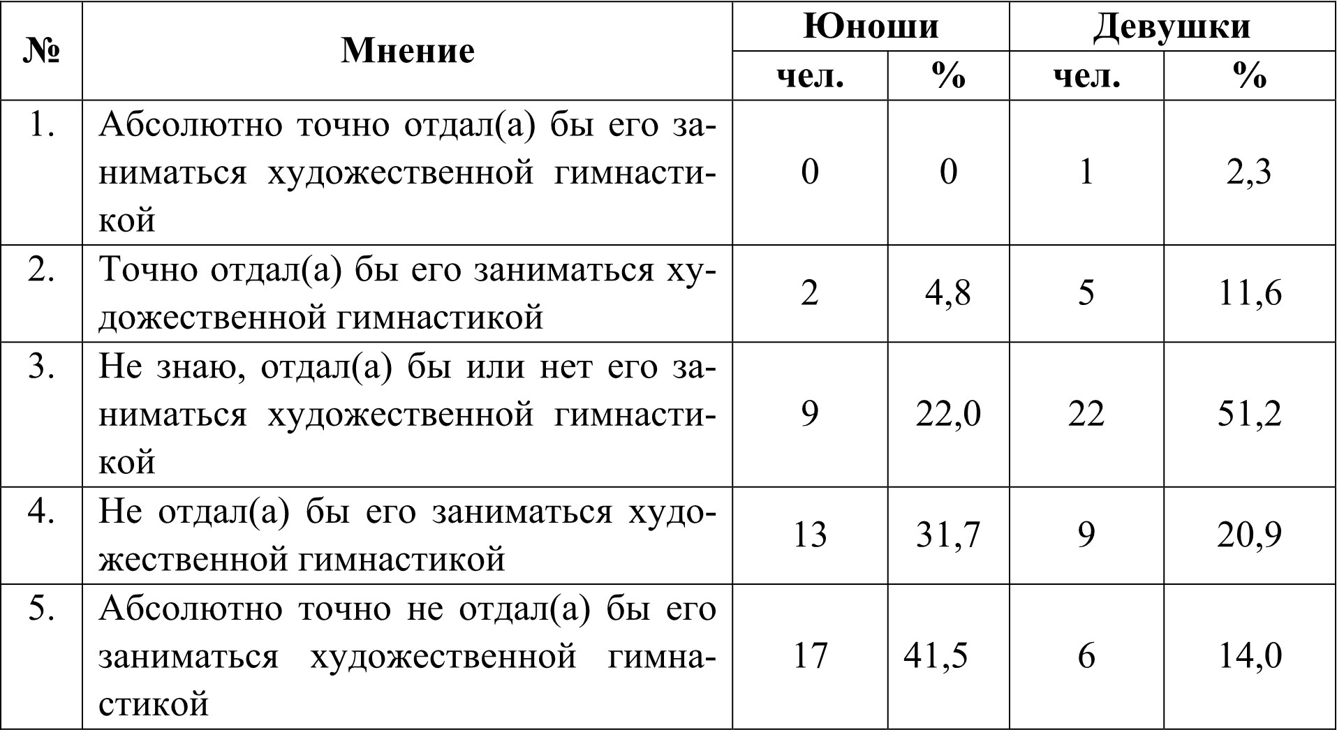 1. Если бы у меня был сын, то я: «абсолютно точно отдал(а) бы его заниматься художественной гимнастикой»; «точно отдал(а) бы его заниматься художественной гимнастикой»; «не знаю, отдал(а) бы или нет его заниматься художественной гимнастикой»; «не отдал(а) бы его заниматься художественной гимнастикой»; «абсолютно точно не отдал(а) бы его заниматься художественной гимнастикой».