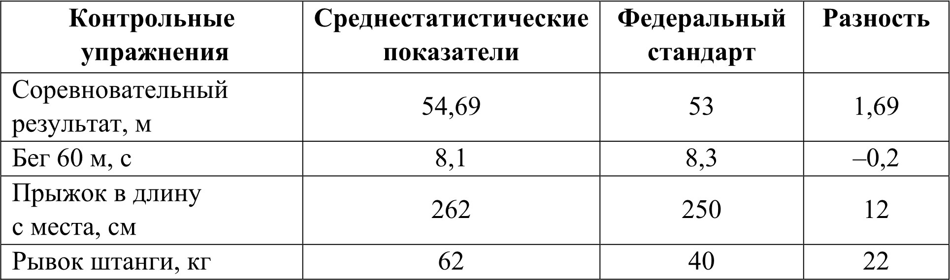 Из таблицы 1 видно, что результаты испытуемых не только соответствуют требованиям Федерального стандарта, но даже превышают их по всем параметрам.